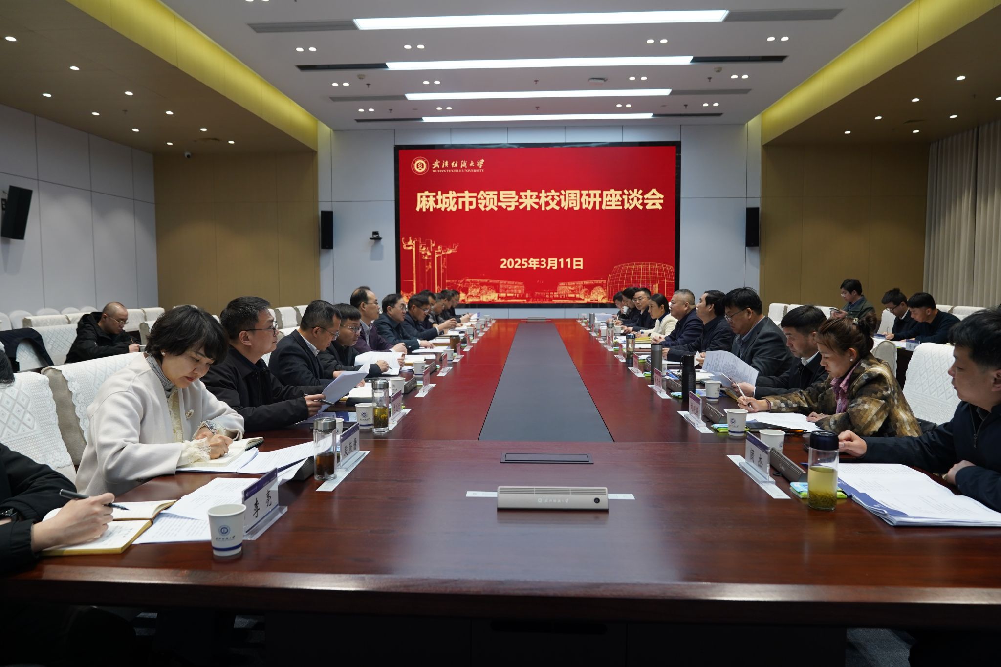 会上,麻城市科技和经信局、市文化和旅游局、市信安国融集团、市产业发展服务中心、孝感乡公园管理中心、湖北凤凰白云山药业有限公司、麻城华棉纺织有限公司等相关负责人与我校学校办公室、组织部、研究生院、本科生院、发规处、科发院、财务处、纺织科学与工程学院、马克思主义学院、全国重点实验室等部门负责人围绕校地合作、产教融合、科技成果转化等方面工作进行了交流。