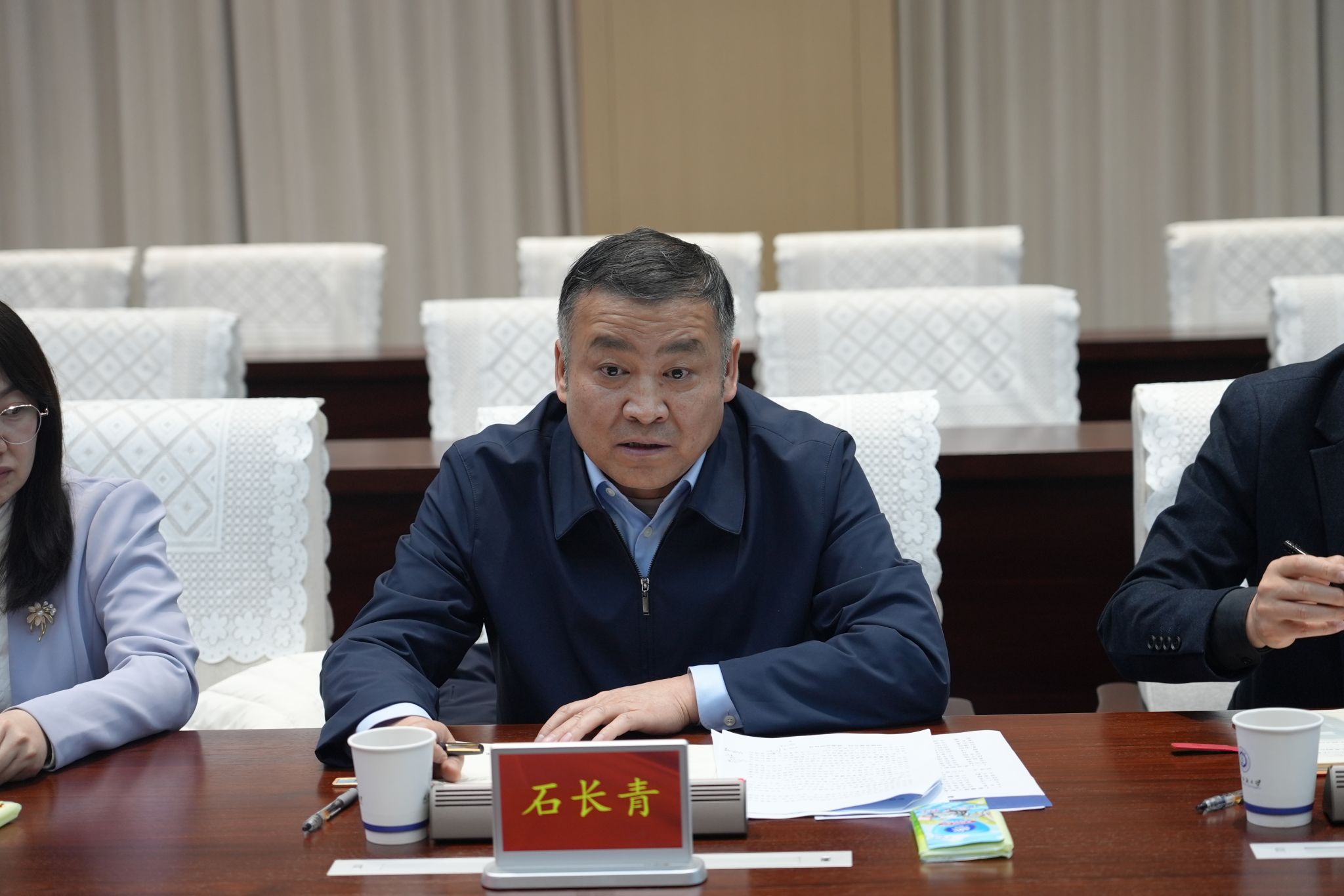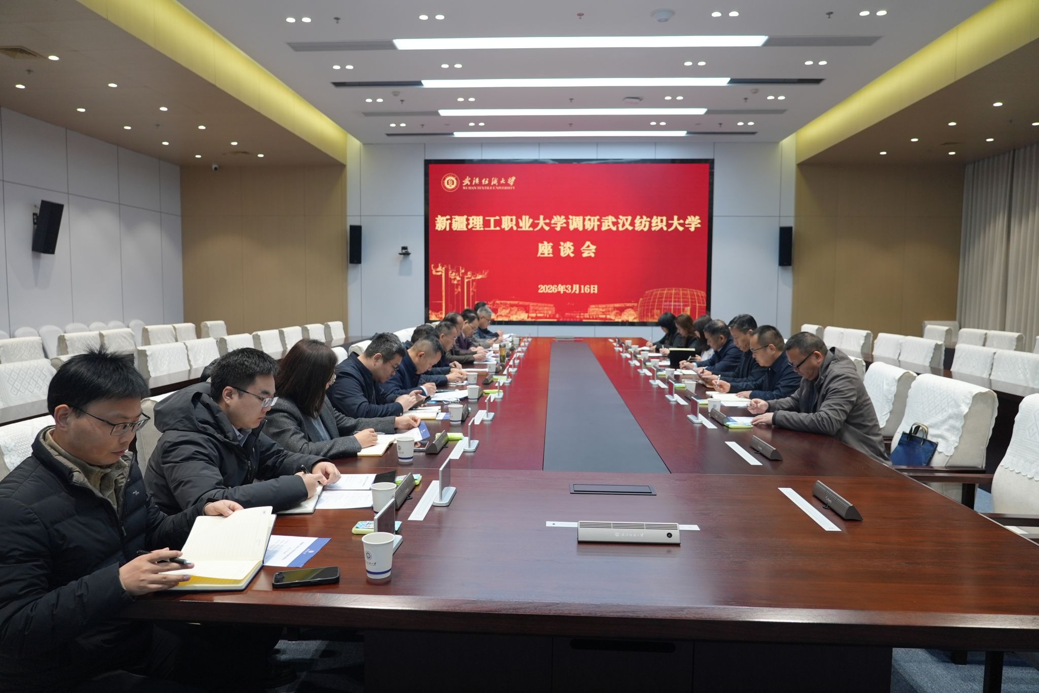 石长青对学校的热情接待表示衷心感谢,并详细阐述了新疆理工职业大学的建设背景、办学使命以及当前发展情况。面向未来,他希望借助武汉纺织大学国家级平台、高端人才及师资等方面的突出优势,助力新疆理工职业大学持续深化内涵建设,不断提升办学质量和综合实力。他表示,期待双方在项目申报、师资培养等领域进一步加强务实合作,持续拓展合作深度与广度,携手推动两校融合发展迈上新台阶。